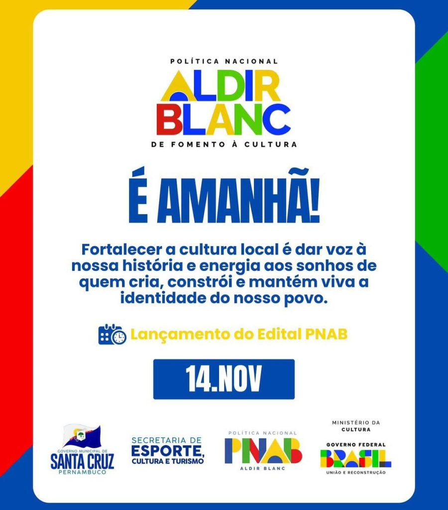 Agentes culturais de Santa Cruz! Tem novidade chegando! Amanhã acontece o lançamento oficial do edital da PNAB, com apoio do Ministério da Cultura. Fiquem ligados nos perfis oficiais da Prefeitura de Santa Cruz e da Secretaria de Esporte, Cultura e Turismo para não perder nenhuma informação!